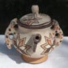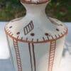 Ravier ovale blanc aux motifs ethniques ocres et noirs. Cette poterie moderne est décorée de motifs librement créés par la potière.