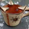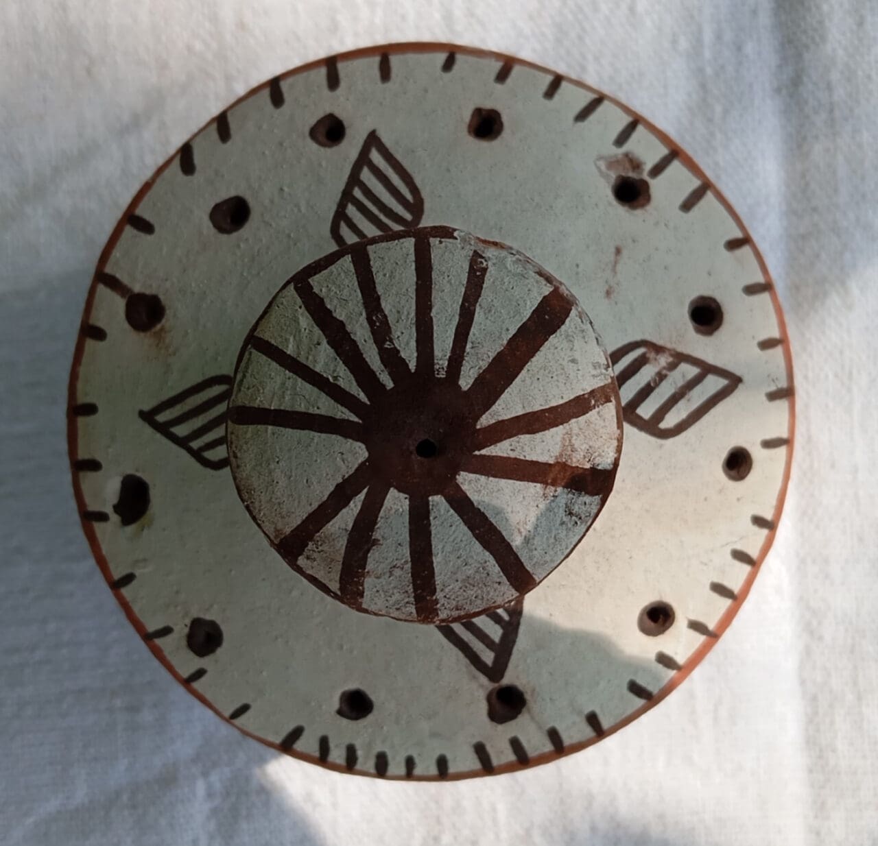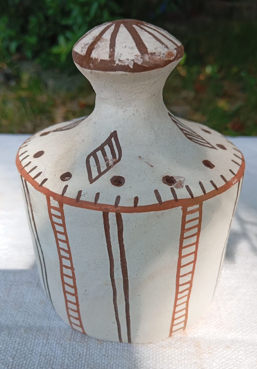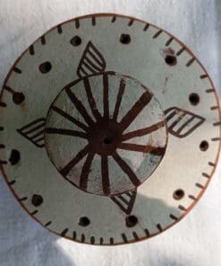 Support à bâtonnets d’encens aux motifs géométriques. Cette poterie moderne dont la forme est inventée par la potière est décorée des motifs qui sont maintenant sa marque.